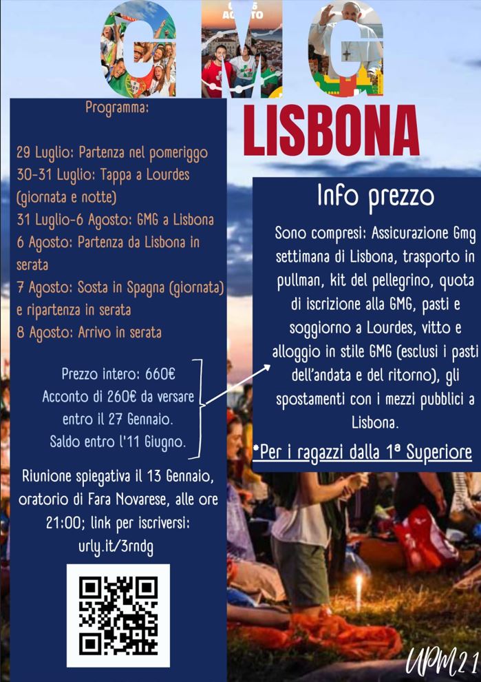 GMG 2023, date: dal 29/07 al 08/08 2023, a Lisbona, viaggio in pullman, costo 660€ (è stato deciso di aderire a livello di upm al pacchetto B), rivolto ai ragazzi dai 15 (2008 compresi)